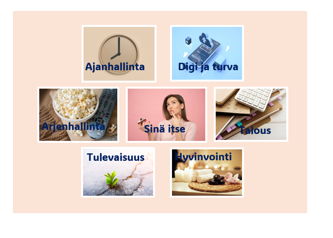 Taloudessa käsitellään oman talouden haltuunottoa ja ja sen merkitystä tunteelle oman elämän hallinnasta. Hyvinvointi nostaa esille mm. stressinhallinnan keinoja ja hyvivoinnin osa-alueita, joihin tulisi kiinnittä huomiota. Digi ja turva on osa-alue, missä pohdistaan, mitä jokaisen on hyvä tietää omasta toimintaympäristöstään digitalisoituvassa maailmassa. Tulevaisuus osio puolestaan suuntaa katseen tuleviin vuosiin, ottamatta kantaa siihen, missä elämänvaiheessa kukin juuri nyt on.